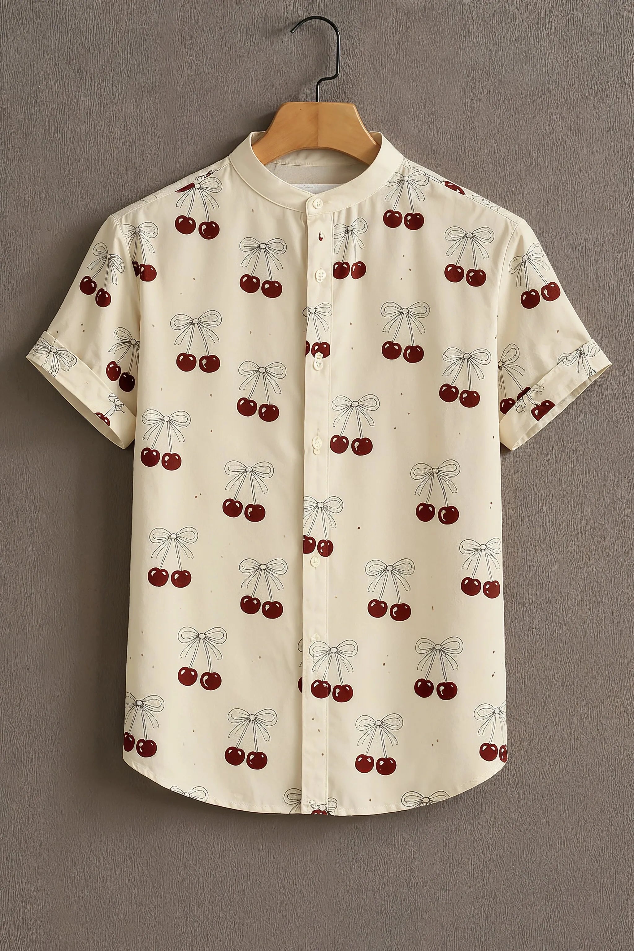 Add a fun, playful twist to your style with this Men’s Cream Casual Shirt featuring an all-over cherry print. Designed with cute outlined bows paired with bold red cherries, this shirt brings a youthful, trendy, and refreshing vibe—perfect for casual days, outings, vacations, or café dates.